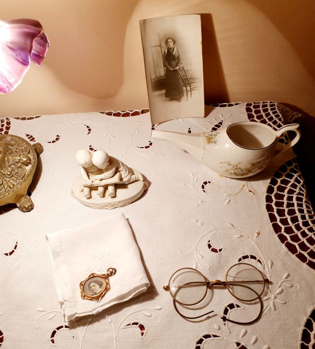 La fotografia ens recorda la jove Josefa Bonet Sobrevila. El seu rostre és també el que es veu en aquest relicari. El recipient de porcellana el feia servir el meu avi, Delfin Bonet Sobrevila, delicat de salut, per beure el brou amb comoditat. Les ulleres són ben antigues i eren del meu besavi, Delfin Bonet Fusimany.