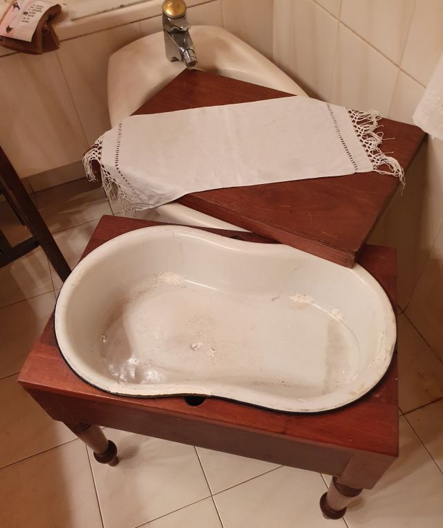 El bidet ja feia anys que a França el feien servir. Aquest model és per estar amagat ja que porta una tapa que cobreix la peça esmaltada. És de fusta de caoba.