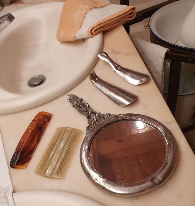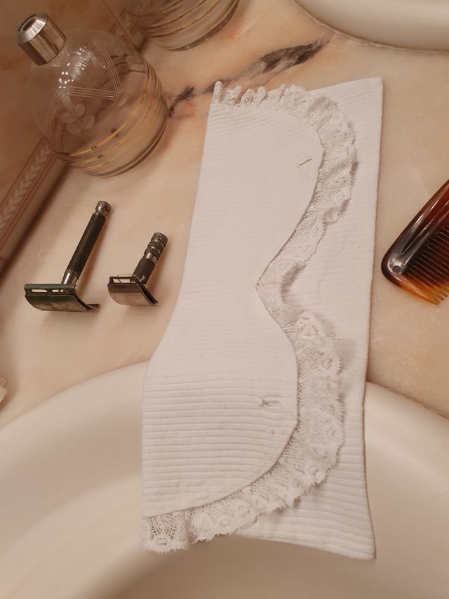 La peça de vidre forma part d’un joc de tocador. La bosseta, cosida a mà i decorada amb puntes, es feia servir per guardar les pintes. Les maquinetes eren per afaitar, la gran, i per depilar, la petita.