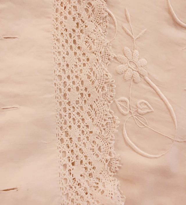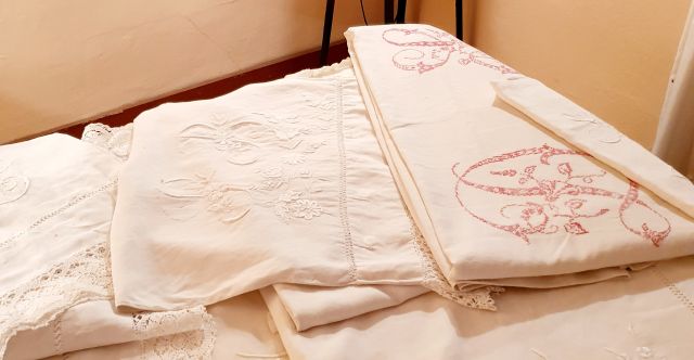 A l’esquerra un altre joc de llit de l’aixovar de Josefa. A la dreta es veu un joc de la seva mare, Dolors Sobrevila Ganyet. D’ella no en queda massa roba ja que, amb els anys i l’ús, es devia anar gastant.