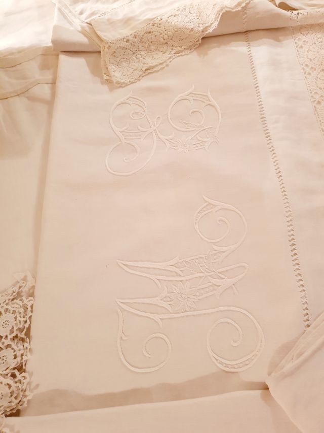 Damunt el llit, cobert amb una colxa d’organdí brodada a mà, s’hi mostraven tots els millos jocs de llit de la família, cosits i brodats per les dones de la casa i, alguns, fets des de fa més de cent anys. Teixits de fil i amb randes sortides dels boixets, embellits amb brodats i amb altres treballs fa que, tot sumat, siguin unes peces fantàstiques.