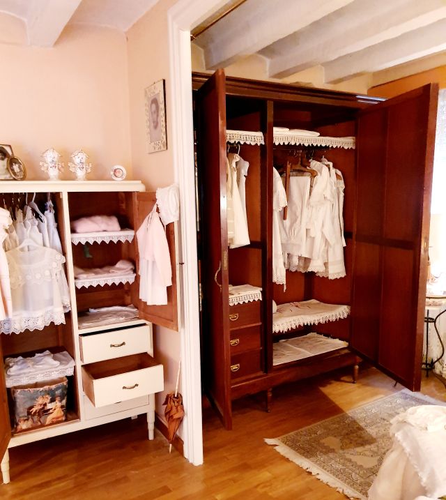 Travessem el que abans havia estat tancat amb una porta i que ara s’hi troba una cortina que separa, és un dir, els dos espais, com podeu veure en aquesta fotografia. L’armari petit amb roba infantil dóna pas a un gran armari de caoba en el que s’hi mostraven vestits de criatura, de bateig i una peça de cadascuna de la roba de l’aixovar de Pepeta/Josefa Bonet Sobrevila, que com s’ha explicat anteriorment, va morir ben jove i, per aquest motiu, la família té tota la roba que tenia preparada pel seu casament.