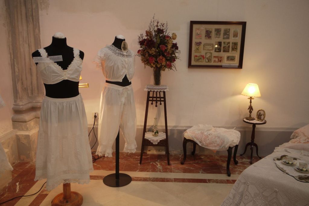 Els sostenidors, les engües, la camisola d’estiu i les calces, vistes de més a prop. Aquestas classe de calces, amb una gran obertura al mig, van cridar molt l’atenció de tothom. Un peça ben curiosa. A l’aixovar n’hi havia moltes però només se’n mostraven dos models.
