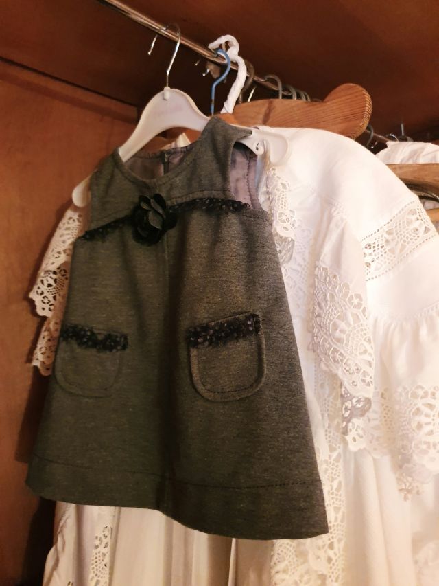 A l’espai de l’esquerra d’aquest magnífic armari s’hi podien veure uns quants vestits de nena fets per Ramona Bonet Estela que va portar la seva neboda, Carme Bonet Trilla.