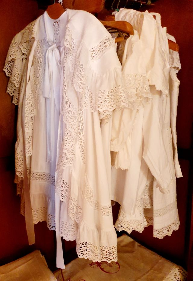En primer pla l’esmentat vestit de bateig que portà el meu pare, Francesc Bonet Estela. Al darrera i sostinguts amb diferents classes de penjadors, de ferro i de fusta, que tenen una pila d’anys, s’hi podia veure una mostra de totes les peces de roba interior que es conserven de Josefa Bonet Sobrevila i que totes estan per estrenar. Formaven part del seu aixovar.