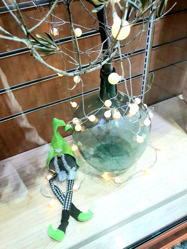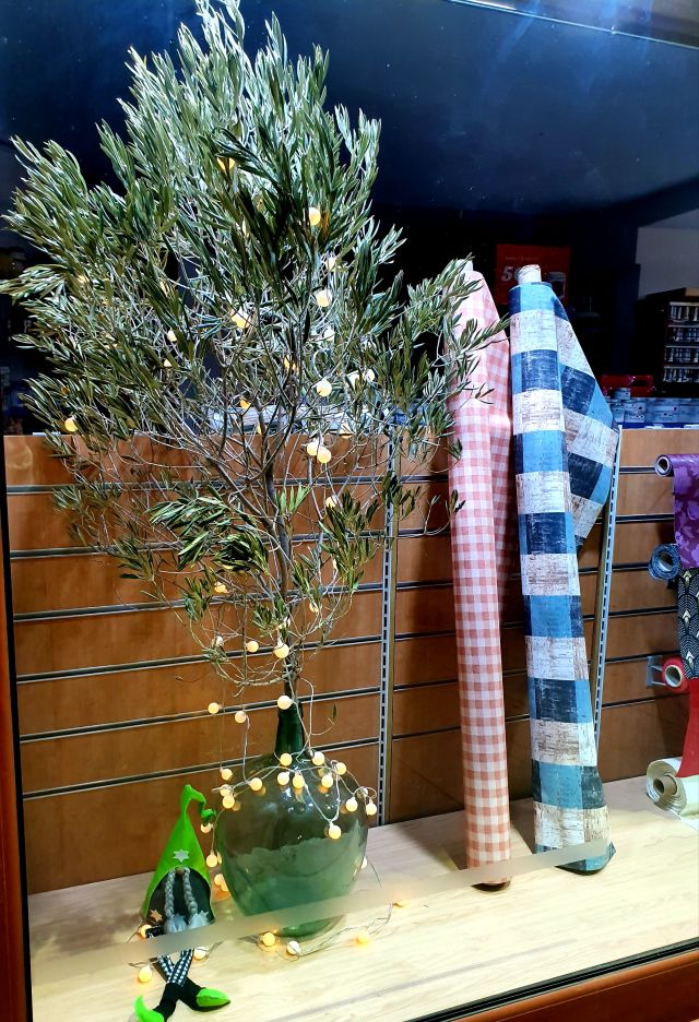Adrogueria Cervi aposta per decorar amb elements molt nostres: de recipient, una gerra de vidre i, d’arbre, una branca d’olivera. Molt bonic.