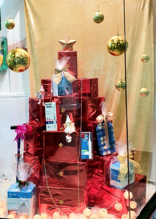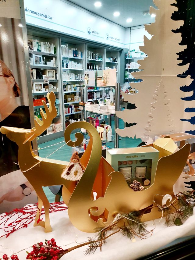Farmàcia Martorell ens dóna una visió del seu establiment a través d’una aparadors amb peces grans que fan molt goig.