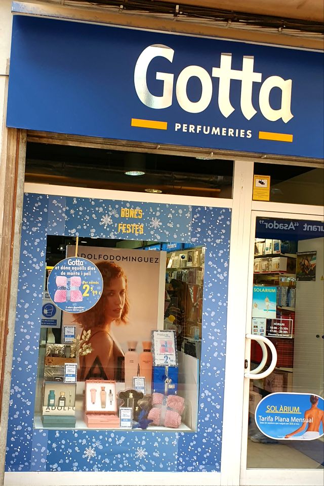 L’aparador de Gotta. Un finestra emmarcada amb blau, que conjunta amb el rètol de l’establiment, i s’obre als productes de la perfumeria.