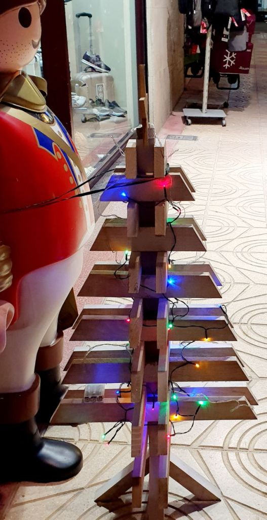 Els comerciants del carrer Combat han unificat la decoració amb un bonic arbre fets amb diferents mides de fustes.