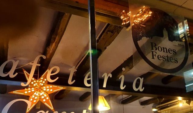 Fixeu-vos que a la dreta hi ha un cercle que porta el perfil de Cervera i les lletres de Bones Festes. És el distintiu dels Comerciants de Cervera i el veureu a tots els establiments que formen part d’aquesta associació.