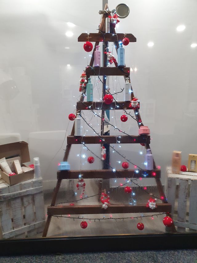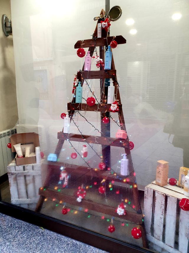 A la Perruqueria d’Eva i Maria Camí hi fa molt goig aquesta estructura d’arbre que sembla fet de manera artesanal. Decorat amb elements nadalencs i productes de l’establiment hi queda d’allò tan bé.