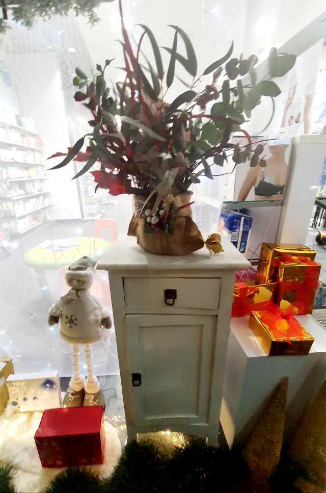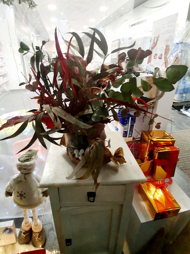 Damunt del moblet hi destaca un bonic centre floral fet amb les plantes típiques de les festes d’hivern.