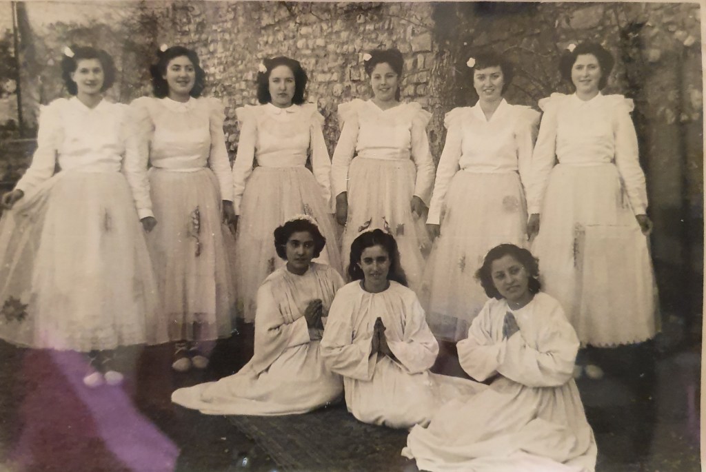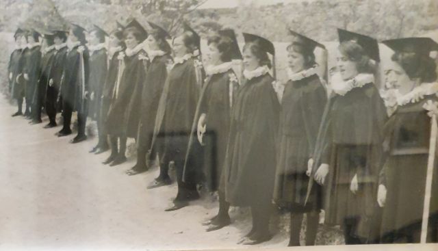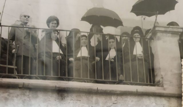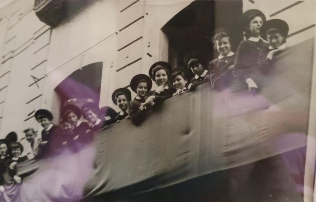 Una fotografia molt simpàtica amb aquestes internes que s’amunteguen al balcó, qui sap si per veure passar alguna processó ja que hi ha un domàs a la barana. La sisena començant per la dreta és la Roser Segura, una alumna que era de Ribé.