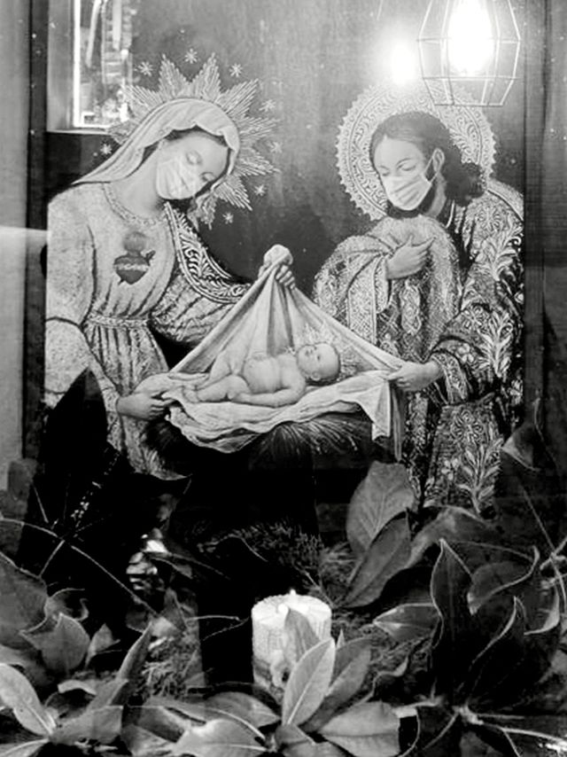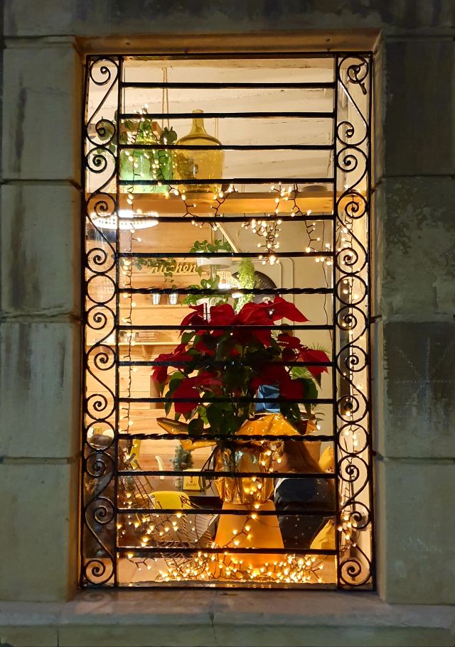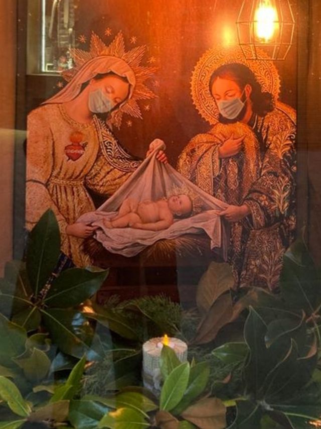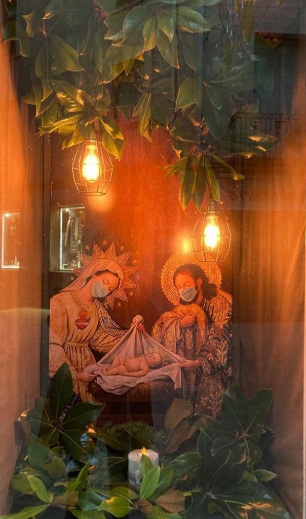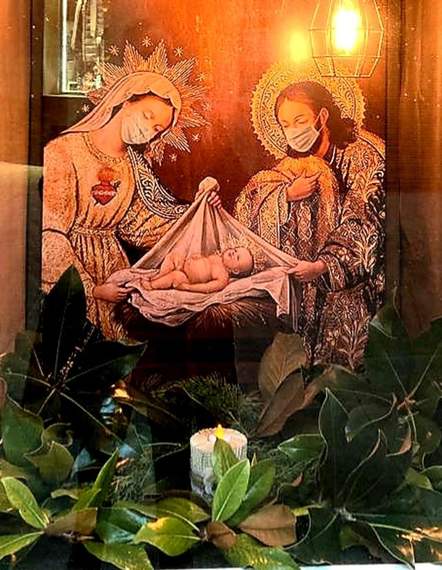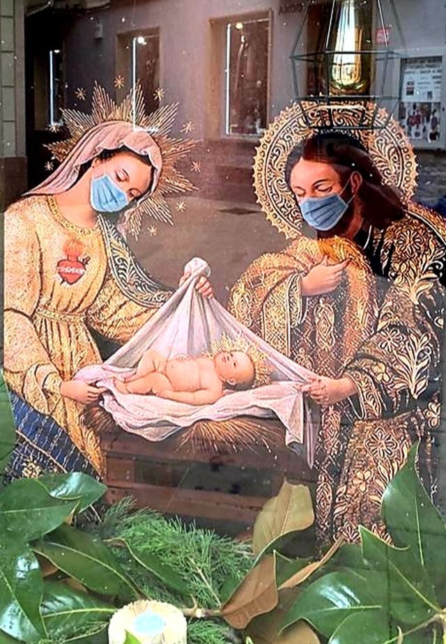L’aparador de la perruqueria Lidia Natural ja va ser presentat al blog però amb unes fotografies molt desdibuixades. Ara el podeu veure molt millor. M’encanta aquesta imatge del Naixement tan antiga i a la vegada tan actual degut a les mascaretes que ens recorden el que tenim al damunt.