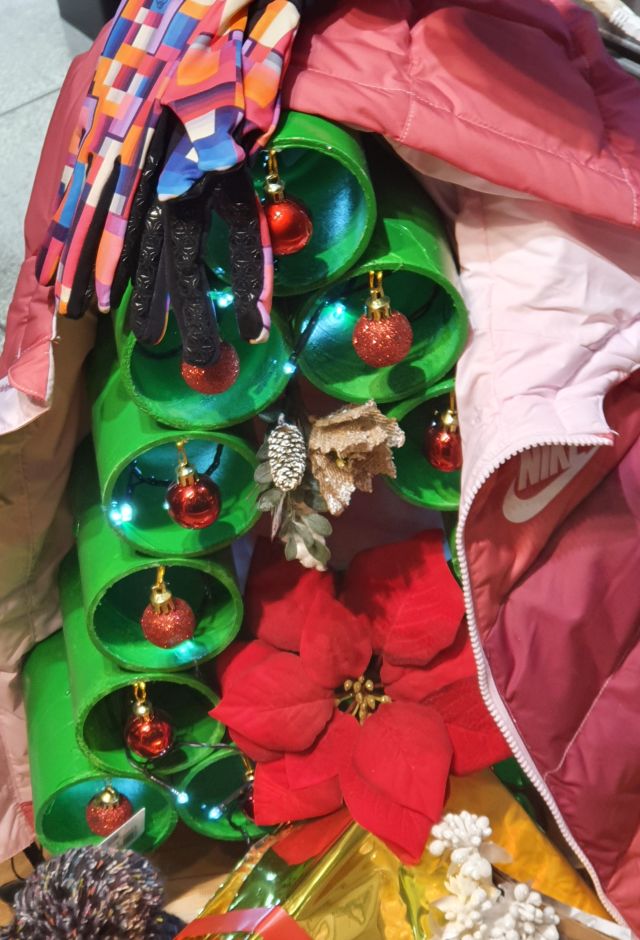 Es va repetint als aparadors un arbre de Nadal fet amb fragments de tubs i sembla que realitzat manualment.