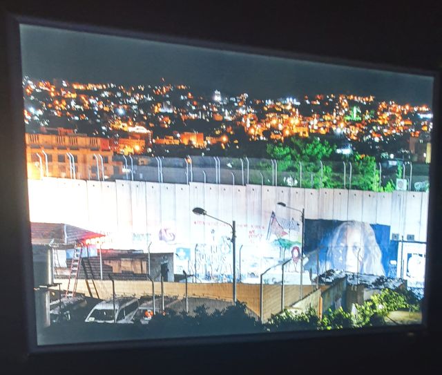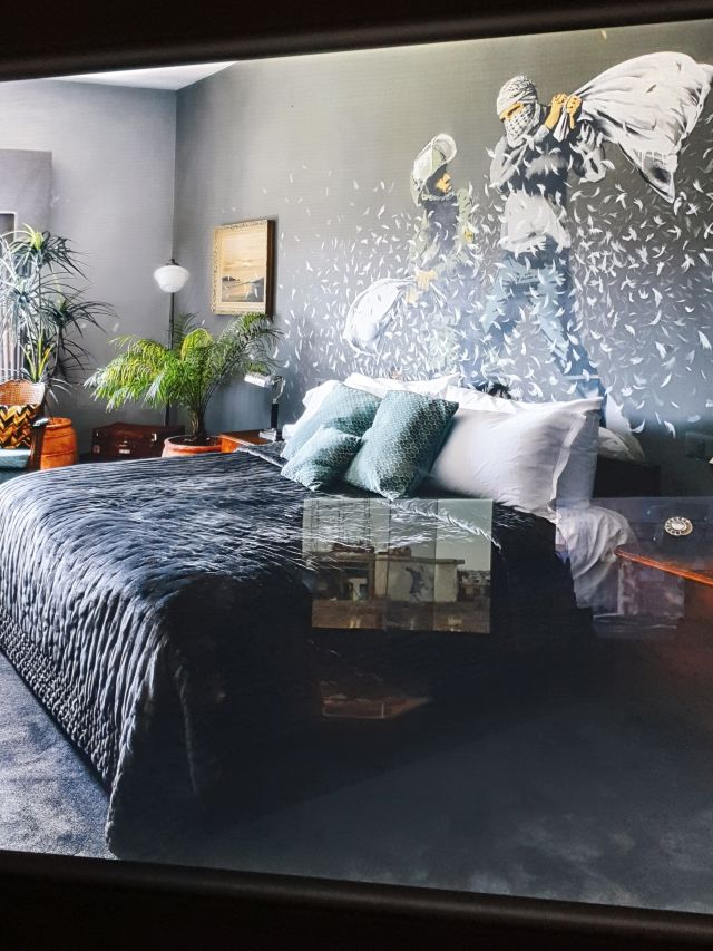 Una de les habitacions de l’esmentat hotel. Un palestí lluita amb un polícia amb plomes com a arma.