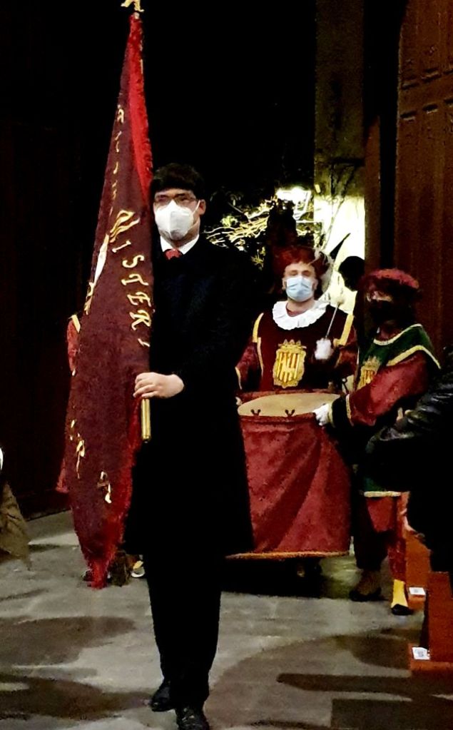 L’entrada del Seguici, que es feia sempre per la porta lateral, aquesta vegada ho va ser per la central. En primer lloc un membre de la Junta del Santíssim Misteri portava la bandera d’aquesta associació.