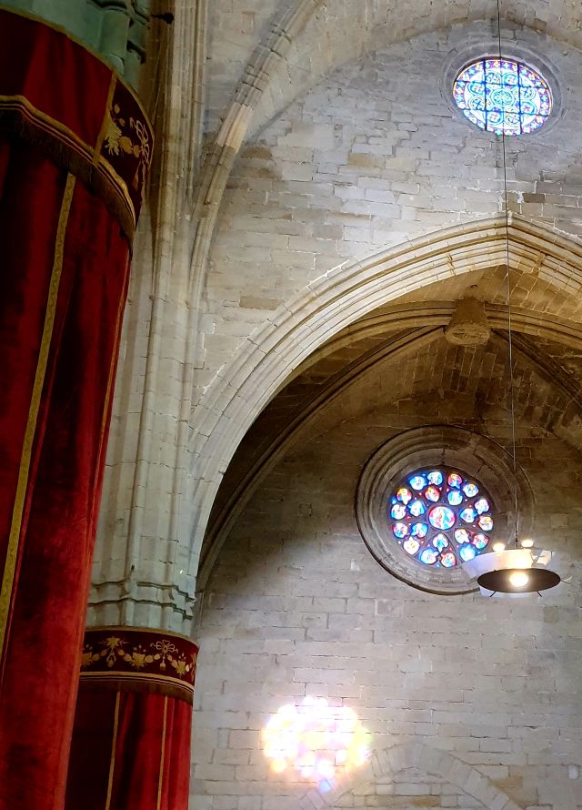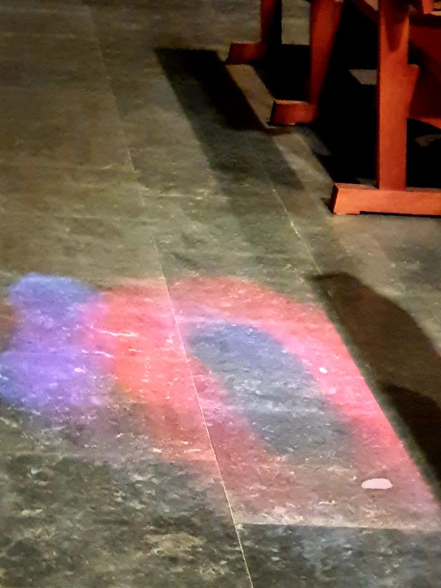 El rosetó de l’altar de la partició del Santíssim Misteri fa un escampall de vistosos colors que queden reflexats al terra.