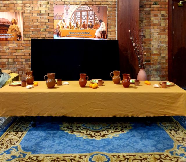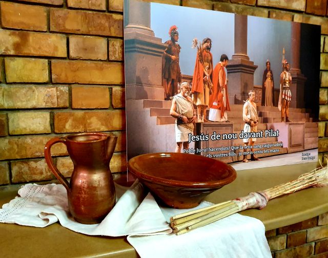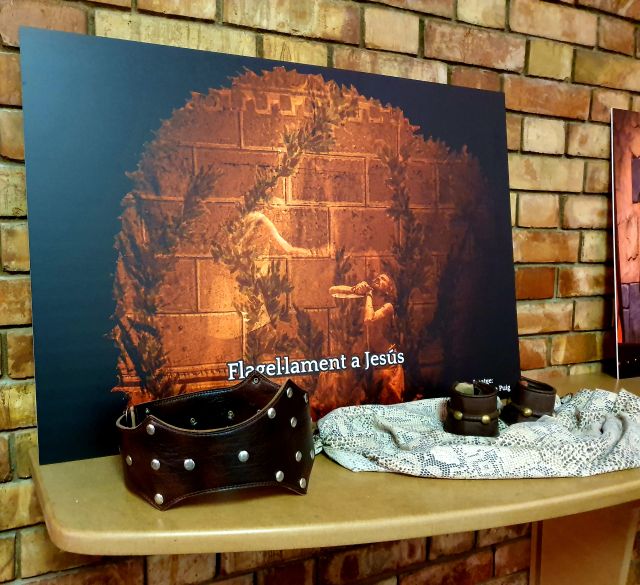 Comencem a fer un recorregut per aquesta mostra encetant-lo pel vestibul. Les fotografies, obra de Gorgina Puig, informaven de les diferents escenes que tenen lloc a la Passió amb el nom en que són conegudes. Estaven acompanyades dels objectes que s’hi relacionaven.