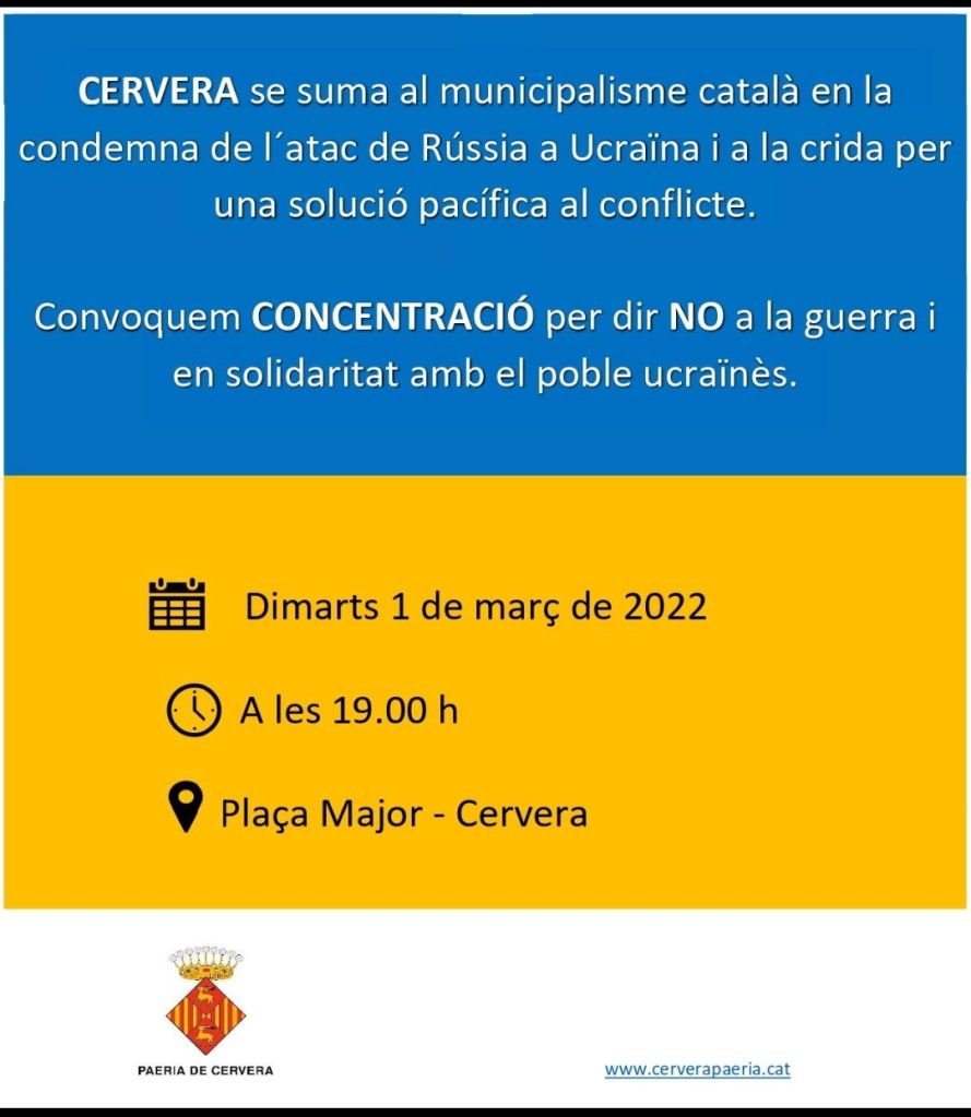 Ahir dia 1 de març de 2022 va tenir lloc una concentració a la plaça Major de Cervera en suport i solidaritat amb el poble ucraïnès i per dir un NO a la guerra.