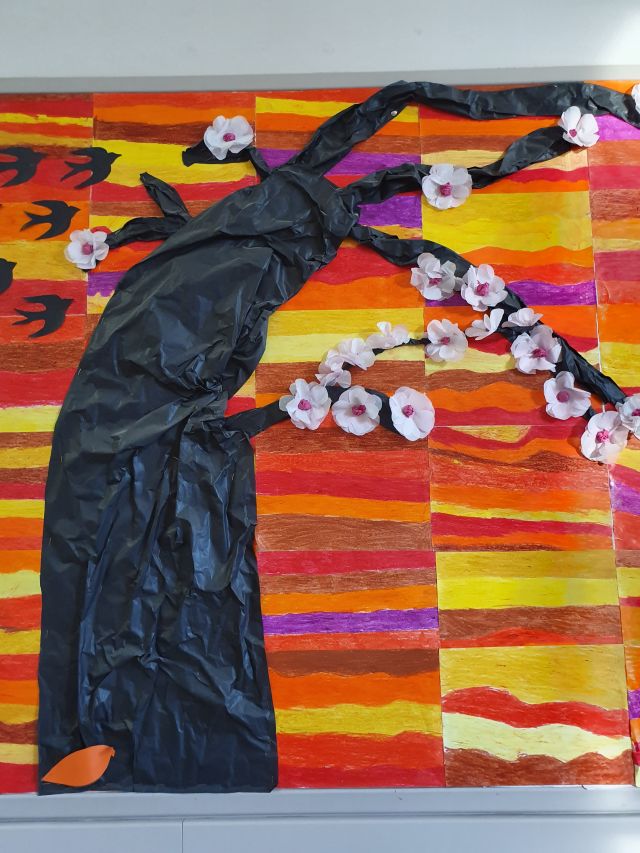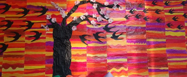 Damunt d’aquest fons hi destaca un ametller florit i un estol d’ocells.