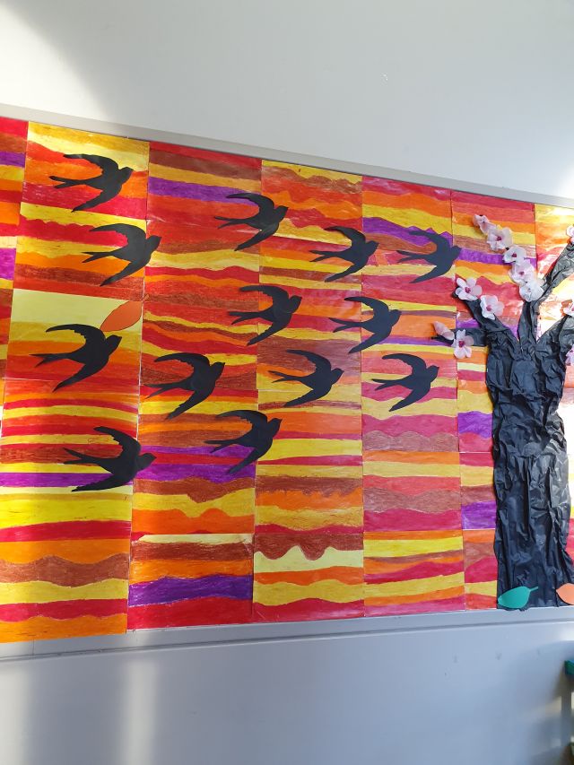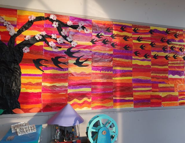 Pugem al segon pis i, amb la mateixa amplada del passadís i disposició de les fantàstiques aules obertes al paisatge dels afores de Cervera, ens aturem davant d’un mural que ens recorda les postes de sol que veiem des de la nostra ciutat.
