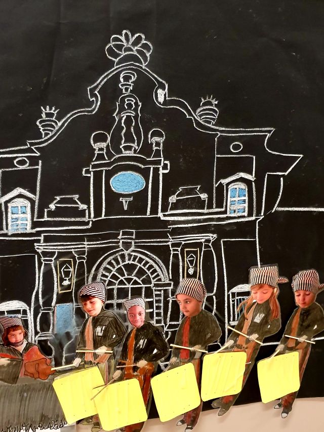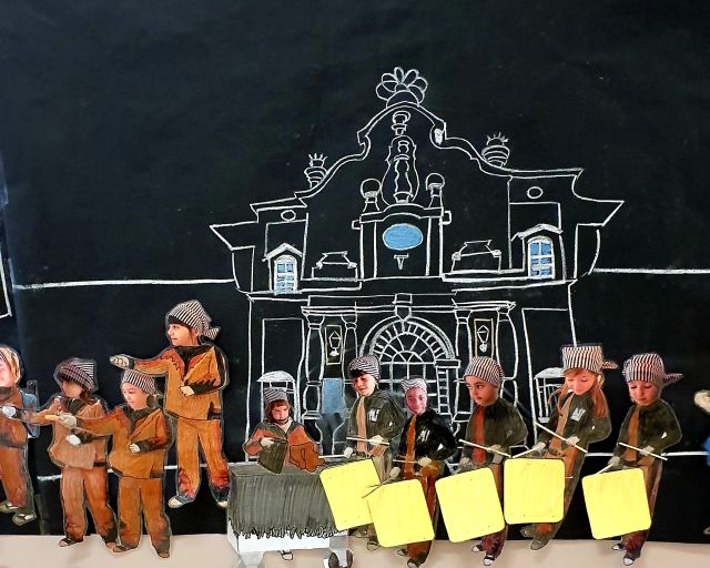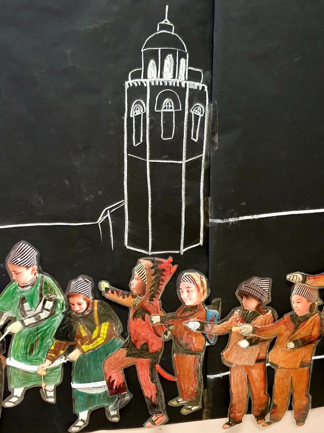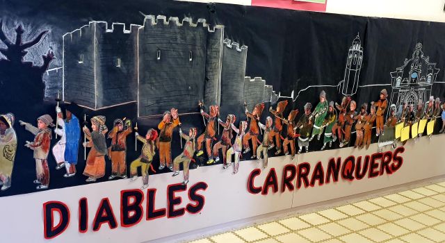 Com podeu veure, amb un fons de diferents llocs emblemàtics de Cervera, els Diables Carranquers amb la cara de cadascun dels alumnes que han fet aquest mural, van desfilant amb molta gràcia.
