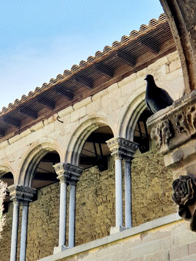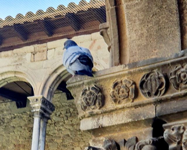 Com podeu veure tot aquest claustre està protegit per una malla que hi hauria d’impedir l’entrada d’aus. Sembla que aquest parell de coloms han trobat la manera de colar-se…