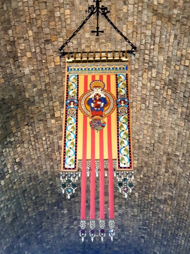 Penjat del sostre s’hi troba l’estendard de la Mare de Déu, reproducció de l’original que hi fou col·locat en la inauguració del 1893.