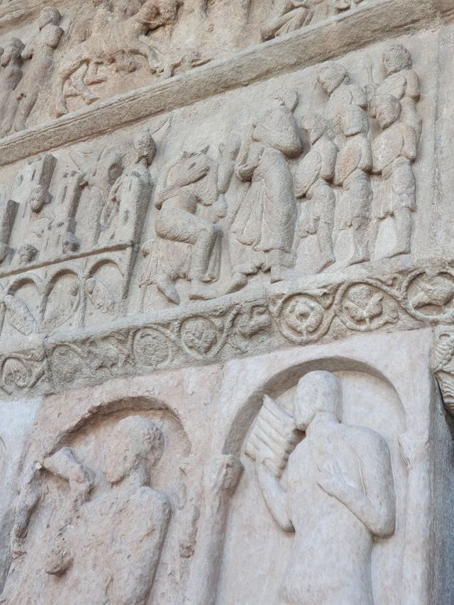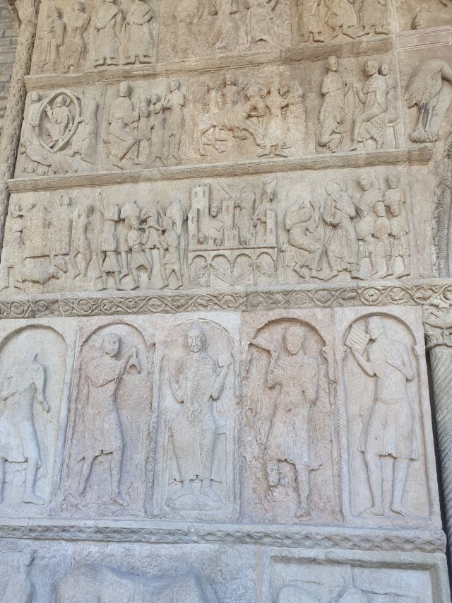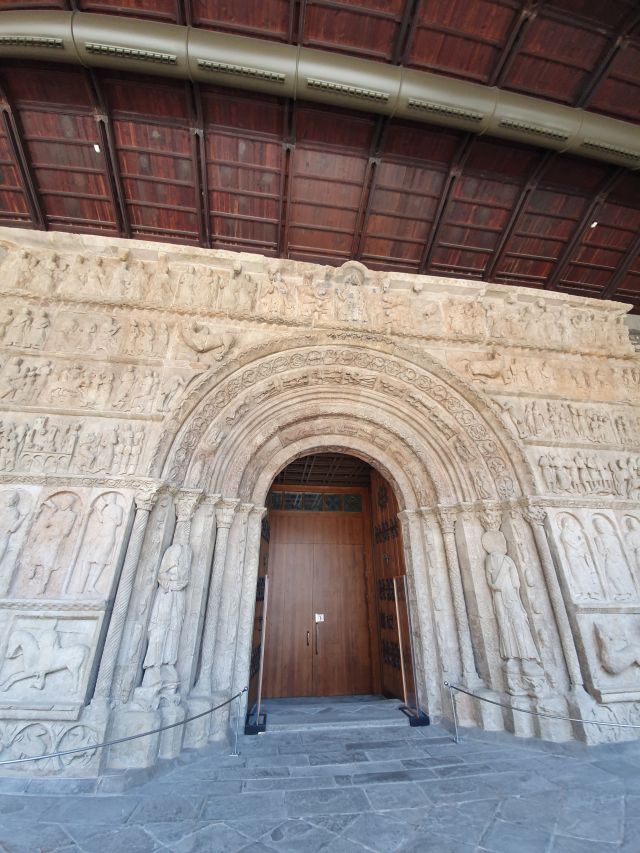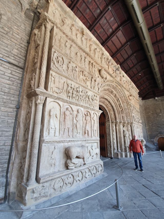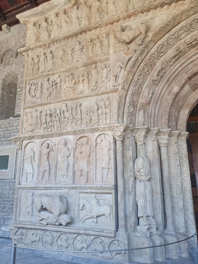Aquesta portalada és una de les peces del romànic català més destacades. Fou construïda al segle XII i es coneguda com la Biblia en pedra. Està formada per un conjunt de blocs de pedra, originalment policromada, col·locats davant la primitiva façana del temple.