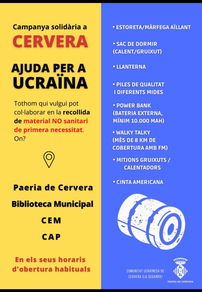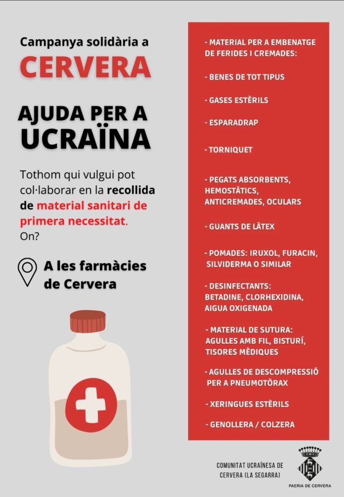 Es van repartir diferents cartells per Cervera explicant el que calia fer per ajudar i poder enviar material necessaria a Ucraïna.