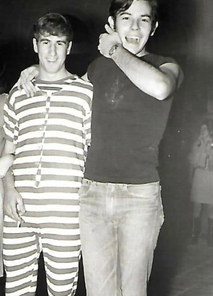 Una vegada més el Jordi ens dóna una imatge que confirma el seu sentit de l’humor. Disfressat amb aquesta mena de maillot de ratlles el vèiem amb un cigarret a la mà. Ja s’havien fet grans i fumaven sembla…