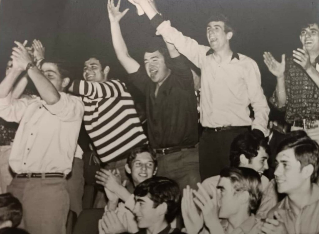 Per l’entusiasme d’aquesta colla sembla que estan veient algun partit i es troben en un moment d’eufòria i de celebració. Josep M. Orobitg amb el seu jersei “navy”, al seu costat, Mestres i un Jordi exultant que fa goig de veure.