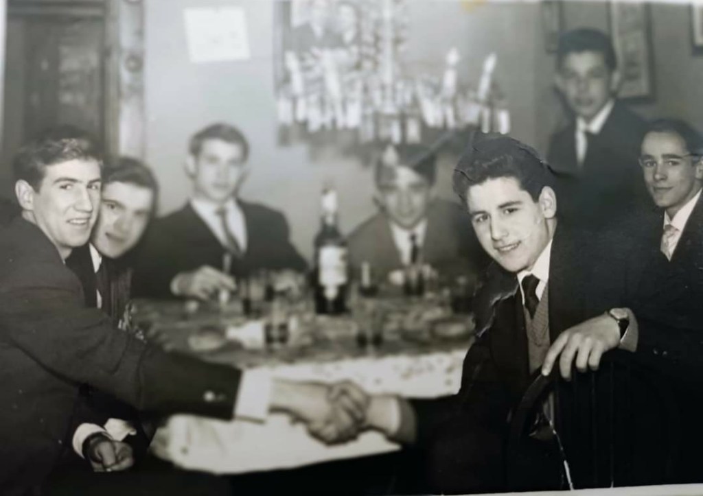 Una imatge entranyable perquè, possiblement, ens mostra el menjador d’una casa particular amb una làmpada d’aquella època que il·luminava directament la taula. Sorprén que vagin tan ben vestits en moltes de les fotografies. El Jordi i el Josep M. es donen les mans simbolitzant aquesta gran amistat que tenien. Al fons, a l’esquerra, hi ha el Joan Royes i, al seu costat, el Josep Antoni Serra. Molt difuminat es veu el Josep M. Riera i, a la dreta, el Josep Lluís Piera, que sembla que de tant en quant també sortia amb aquesta colla.