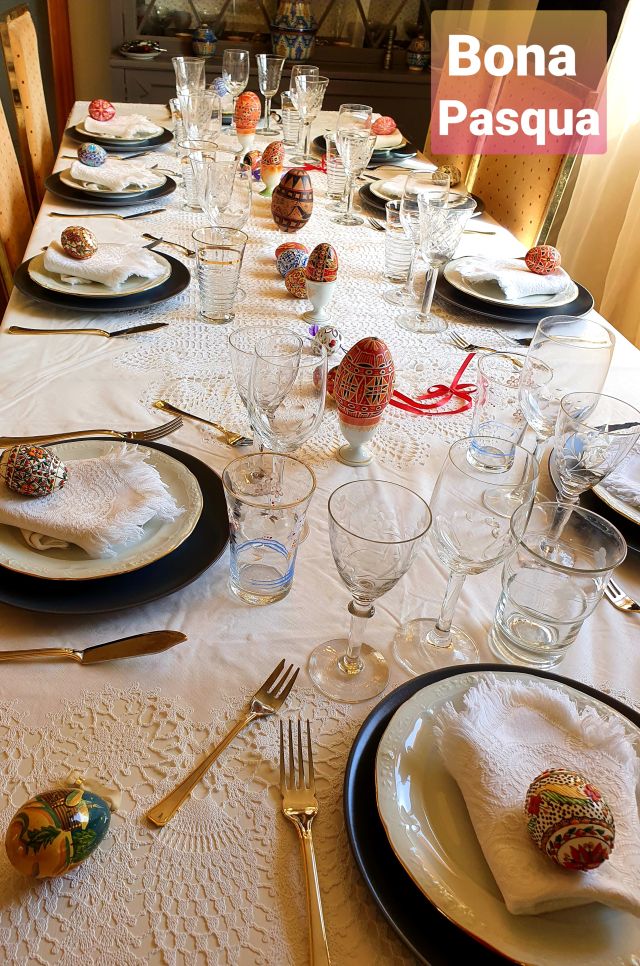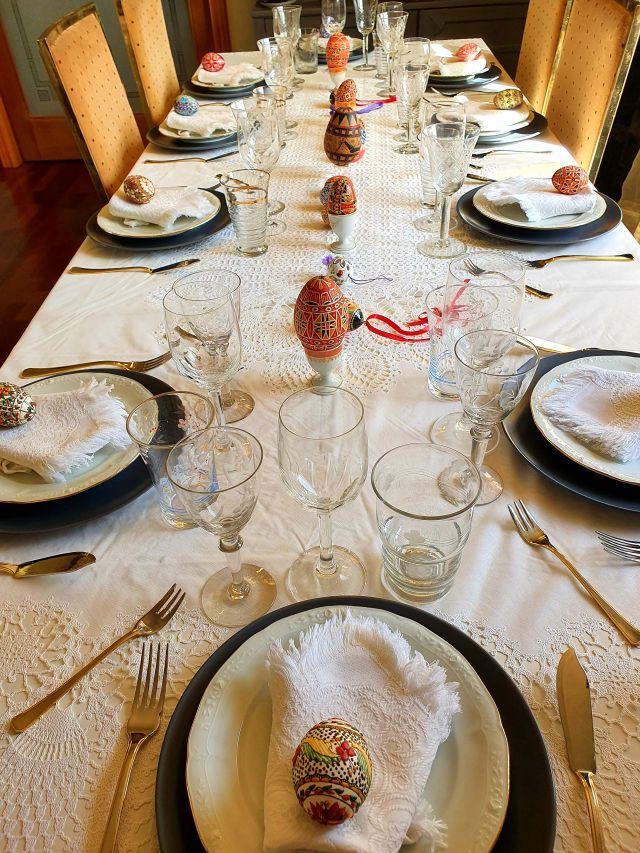 A la resta d’Europa, aquí no és costum, en aquestes dates s’esmercen molt decorant ous de Pasqua. N’hi ha de totes menes: dels que ponen les aus, als que hi han fet un petit foradet i han buidat el de dins i, després, han pintat, de fusta, de ceràmica…Cal dir que són molt bonics i que en cada lloc tenen els seu estil especial. Aquesta taula està decorada amb ous procedents de diferents països d’Europa.