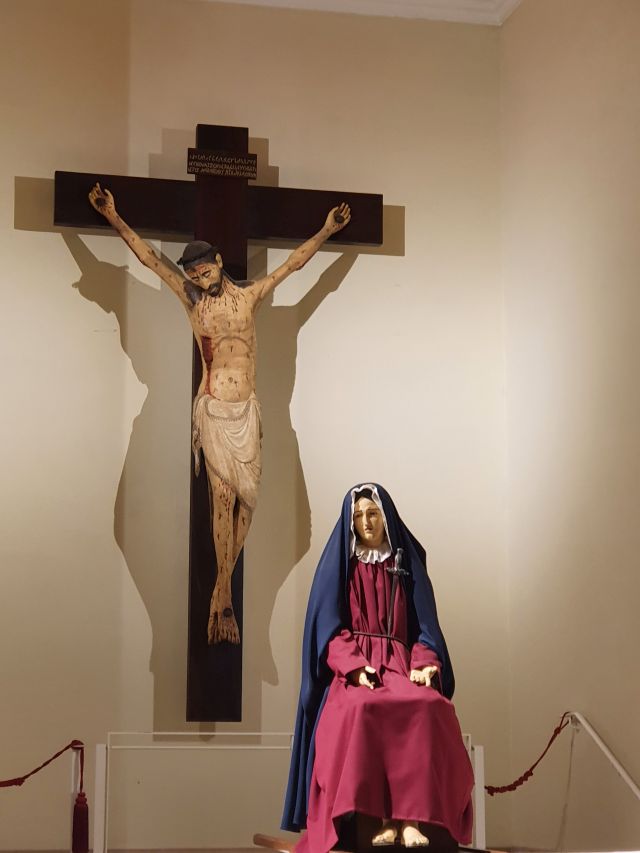 Una imatge inèdita aquesta de la Dolorosa a l’altar de Sant antoni amb el Sant Crist al darrere.