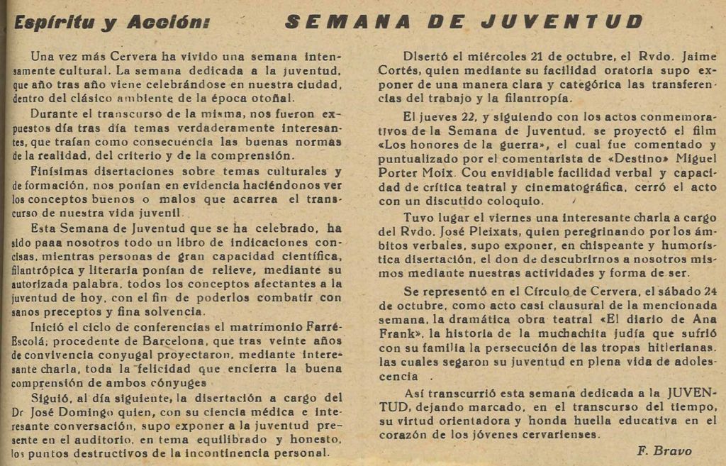 Fixeu-vos en com està escrit el text i tot i que sembla que el pes fort eren les conferències per encaminanr la joventut hi podem destacar que hi va haver un convidat important el dia que es va projectar la pel·lícula. El col·loqui posterior en dèien Cine Forum i va anar a càrrec d’un comentarista de la revista “Destino”, de molt prestigi, que era Miquel Porter i Moix. La cloenda va ser l’obra de teatre abans esmentada.