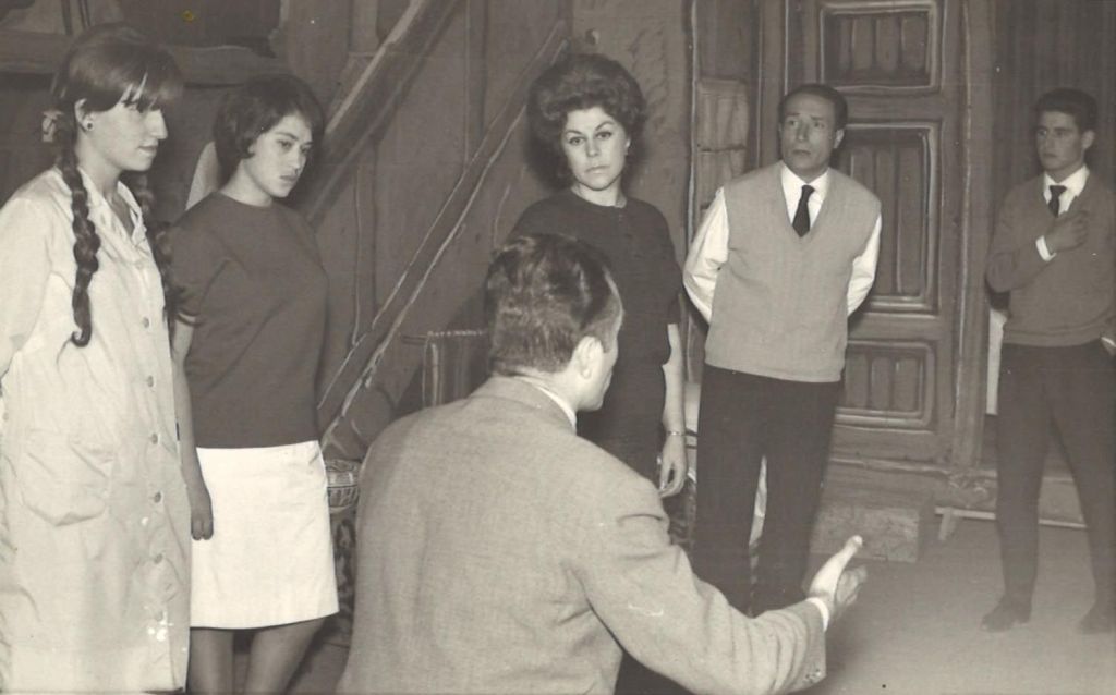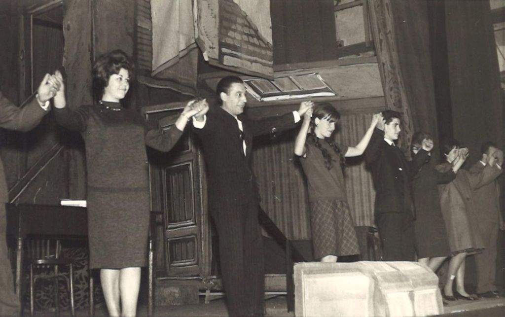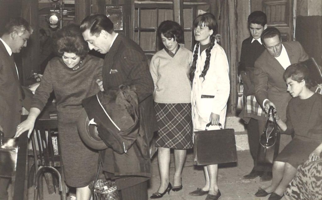D’esquerra a dreta, Romi Porredon, Lidia Guardia, M. Carmen Ayala, esposa del director de l’obra, Sr Morales, Amadeu Comorera i Josep M. Orobitg.