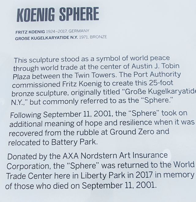 Aquí explica, en la nova ubicació d’aquesta Koening Sphere, com ha anat la seva trajectòria al llarg d’aquests anys de restauració de la zona. Recordo que jo la vaig veure a Battery Park i, ara, ja està al lloc que li pertoca.