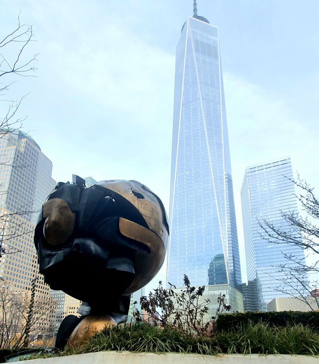 En primer pla lEsfera i, al darrera, l’edifici capdavanter del nou One Trade Center al que cal pujar sí o sí.
