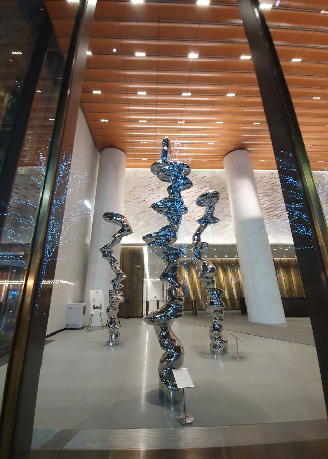 On s’hi exhibeixen unes escultures molt d’acord amb l’estètica de l’edifici.