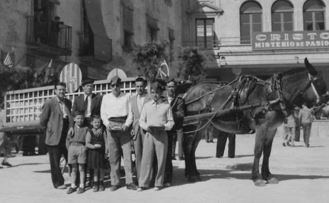 Tot i ser al mes de maig encara es representa La Passió, coneguda aleshores amb el nom de “Cristo, Misterio de Pasión”. Podeu veure el rètol penjat de la balconada del Casal. En aquests anys encara no s’havia construït el Gran Teatre i les representacions es feien a la sala de cinema del Casal.