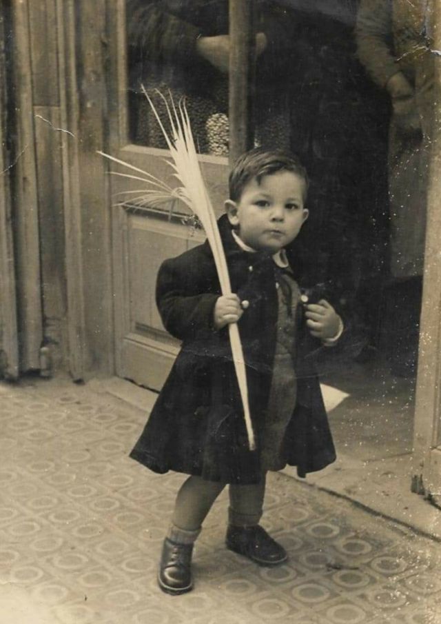 Una monada de nen, el Josep M. Riera Riera, feliç amb el seu palmó petitó com ell. No sé on està feta aquesta foto però, a part de la rajola típica de les voreres, a l’esquerra, es veuen unes portes de fusta que es plegaven durant el dia. Feien la funció que tenen avui les reixes de metall. A la nit es tancaven per protegir les cases. Com podeu veure les portes d’entrada als habitatges eren ben fràgils: fusta i vidre.