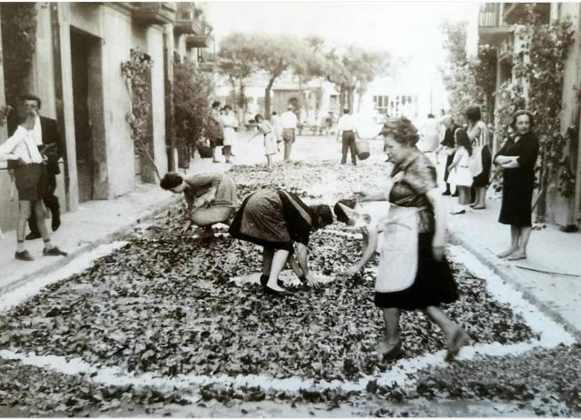 Les catifes tenien molta importància i la majoria de carrers s’esmerçaven perquè quedessin d’allò tan bé. S’identifica la senyora de cal Guspí, en primer pla. Al fons, es veu la bàscula que tant bonic hi feia a la placeta i que, més endavant, es va treure esguerrant del tot aquest espai al fer-hi un brollador que mai va agradar a ningú.