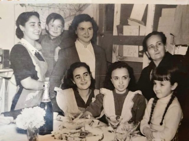 D’esquerra a dreta: Maria Farré, que era la filla gran de “cal Balagé i, porta el seu fill, Enric Herrera, als braços. En fer-se gran hi va haver un temps que sovintejava Cervera i va venir amb la nostra colla. El recordo perfectament. Al seu costat hi ha la Carmeta Farré, la germana petita de la casa i que fou la mare de Maria Dolors Sàrries. Al seu davant, asseguda, l’esmentada Tresina. L’altra jove és Pepita Palma que estava casada amb el Pepe Farré, també fill de “cal Balagué”. la nena és la Montserrat Gómez, filla de la Tresina Felip i del Frederic Gómez. A la dreta hi ha la iaia de la casa mare dels tres fills, Maria, Carmeta i Pepe.