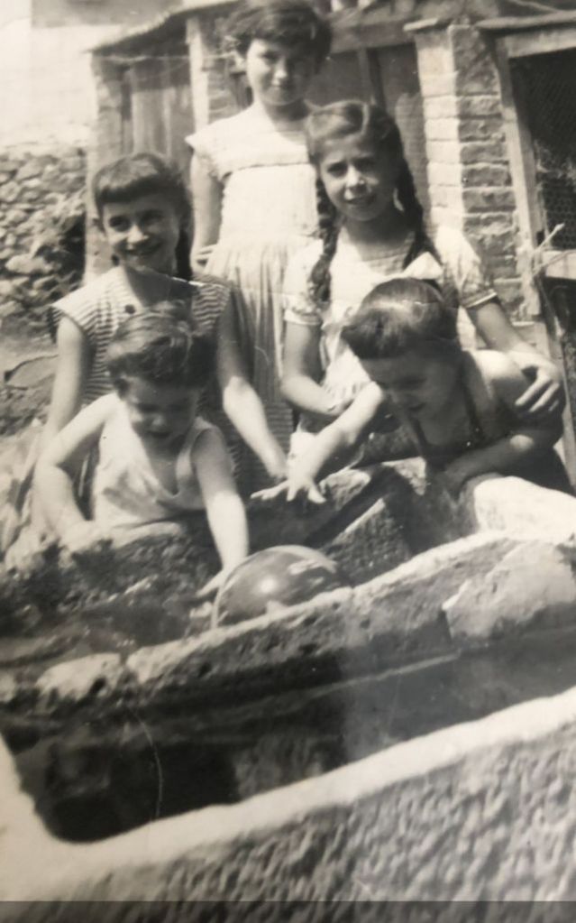 Aquesta fotografia està feta en un espai avui desaparegut. com podeu veure el grupet està davant d’un safareig d’aquells de pedra que es posaven als exteriors. Era a l’hort de “ca la Basília”, un espai que donava darrera l’Hospital i que comunicava amb l’habitatge. Es va vendre a una parella de joves i l’hort va desaparéixer ja que per guanyar espai es va buidar tota la terra que el mantenia elevat.