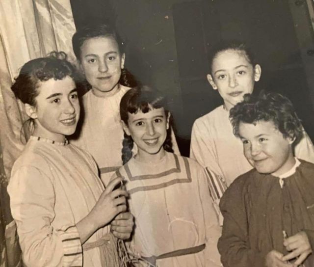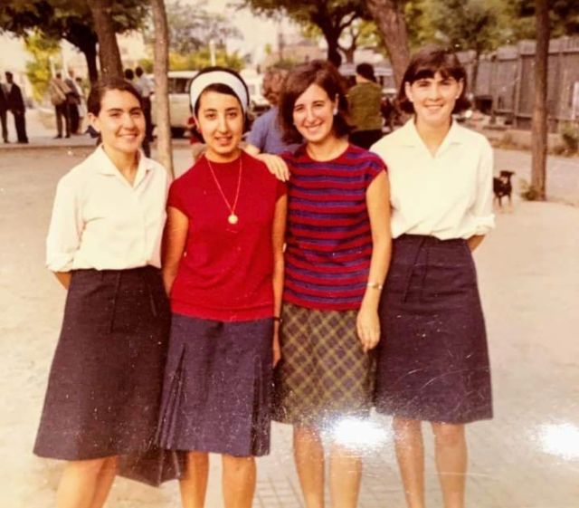 En créixer el tema de les amigues esdevé molt important. En aquesta imatge, ja en color, podeu veure quatre joves que collaven. És una fotografia que ens dóna informació sobre el vestuari de l’època. Les dues germanes van vestides igual, tot i que bessones no ho eren. Però era una cosa que es feia. La La Liídia llueix un “turban” per recollir els cabells i sembla que porta la medalla de la Primera Comunió. La Conxita mostra un “look” que en aquell temps no recordo haver-lo vist massa: ratlles i quadres. És va avançar a la moda perquè, després s’ha vist molt aquesta manera de barrejar diferents motius.
