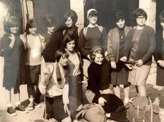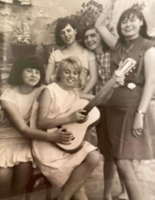 El tema de les amigues sí que és d’ara i de sempre. Aquí en tenim un grupet que collaven: Conxita Bonjoch, M. Dolors Tosal i Pilar Rovira. Amb la guitarra a la má, la seva germana Marta Rovira i, al seu costat, M. Rosa Roselló.
