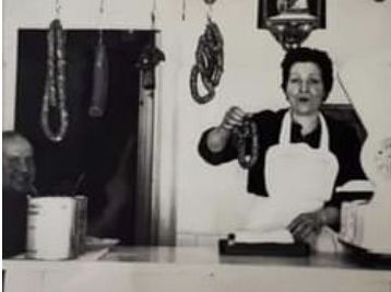 La Sra. Teresa, impecablement vestida, venent els productes de fama que tenien a la botiga.