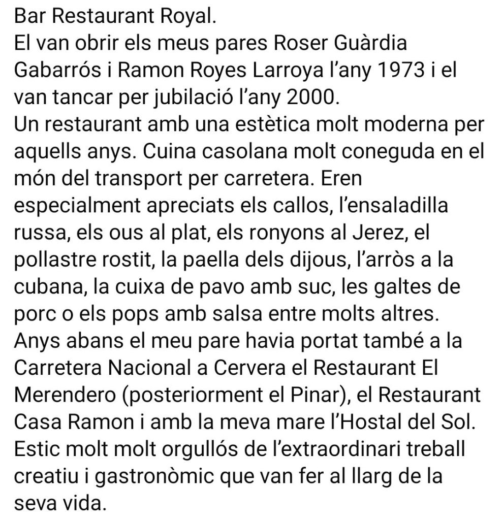 Com podeu veure a la fotografia el “Bar Restaurant Royal”era d’allò tan modern. Avui, en aquest espai, s’hi troben les dependències de “Seyart” una empresa familiar que treballa amb disseny i fabricació de joies i peces de metacrilat.
